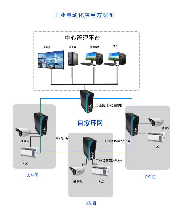在现代工业制造系统里,经过若干个工艺步骤后,一个个的零件被组装成一个产品,各种自动化设备代替了人工,操作人员只需要在控制中心监控流水线上发生的一切。在整个系统中,要求把生产线上PLC,摄像头等各种终端数据传输到监控中心,同时要求网络具备较强冗余备份能力,发生故障后能快速恢复。顺通成系列工业交换机,工业级设计,具备环网冗余功能,自愈时间<20ms,完全可以满足系统要求。